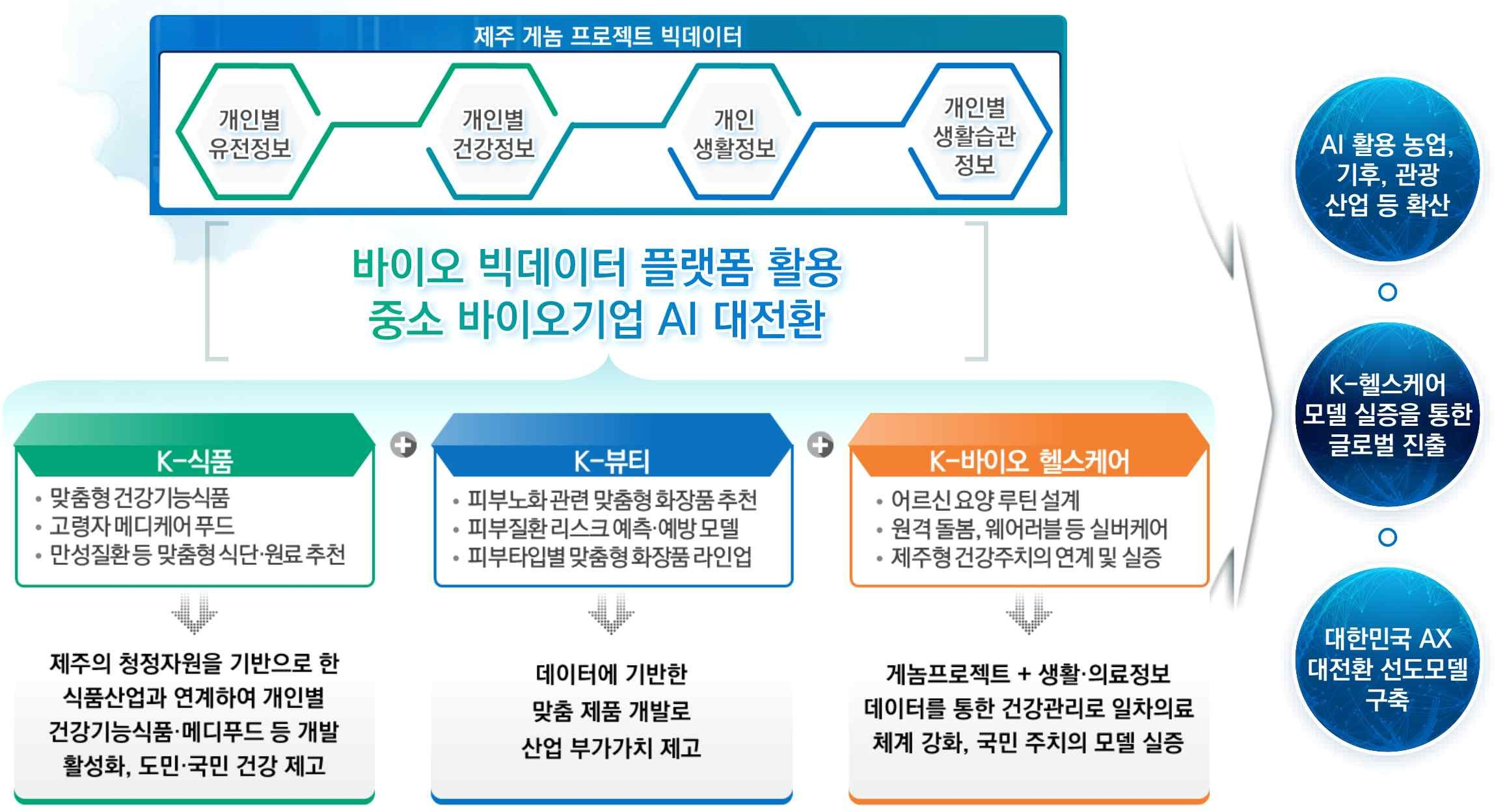 ○ 이번 사업은 제주게놈프로젝트의 바이오 빅데이터(유전체, 건강 정보, 생활습관 정보 등)를 활용하여 K-식품, K-뷰티, 더 나아가 K-바이오 헬스케어로까지 사업을 추진해 나갈 예정이다.