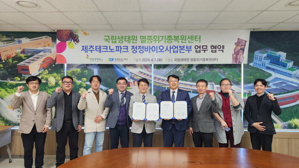 ◌ 제주TP 청정바이오사업본부는 지난 7일 경북 영양군 소재 국립생태원 멸종위기종복원센터(센터장 최승운)에 방문해 ‘멸종위기 야생생물 복원‧보전 강화를 위한 업무협약’을 체결했다고 8일 밝혔다.